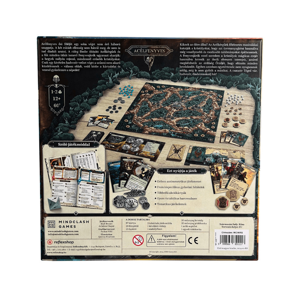 Az Acélfenyves ősi földjén örök harc dúl a rideg fémbe öltözött Acélkérgűek és a természet misztikus erejét birtokló Fenyvesjárók között, akik mindkét oldalról küzdenek a Larimor kristályok megszerzéséért. Az Acélkérgűek célja a kristályok esszenciájának kivonása hatalmas gépeik üzemeltetéséhez, míg a Fenyvesjárók a kristályok mágikus erejét kívánják felhasználni három ősi totem felkutatására, hogy megidézzék az Őrzőt, Acélfenyves védelmezőjét. Ez az aszimmetrikus, kártyavezérelt taktikai játék 1-2 játékos számára kihívást kínál, ahol minden fordulóban 3-3 frakcióspecifikus kártyát játszotok ki, beleértve a csatakezdést és a stratégiai manővereket. Az acélkérgűek parancsnokaként célod a kohók felfejlesztése, míg a fenyvesjárók vezetőjeként a totemek biztonságba helyezése. Ha sikerül felépítened a harmadik kohót, vagy megvédened a harmadik totemet, megnyered a játékot. A társasjáték tartalmaz közös, szóló és frakcióspecifikus elemeket, mint például egy térképet, 20 kristályt, valamint különböző kártyákat és figurákat. Játékosok száma: 2, Játékidő: 60 perc, Ajánlott kor: 12 éves kortól.