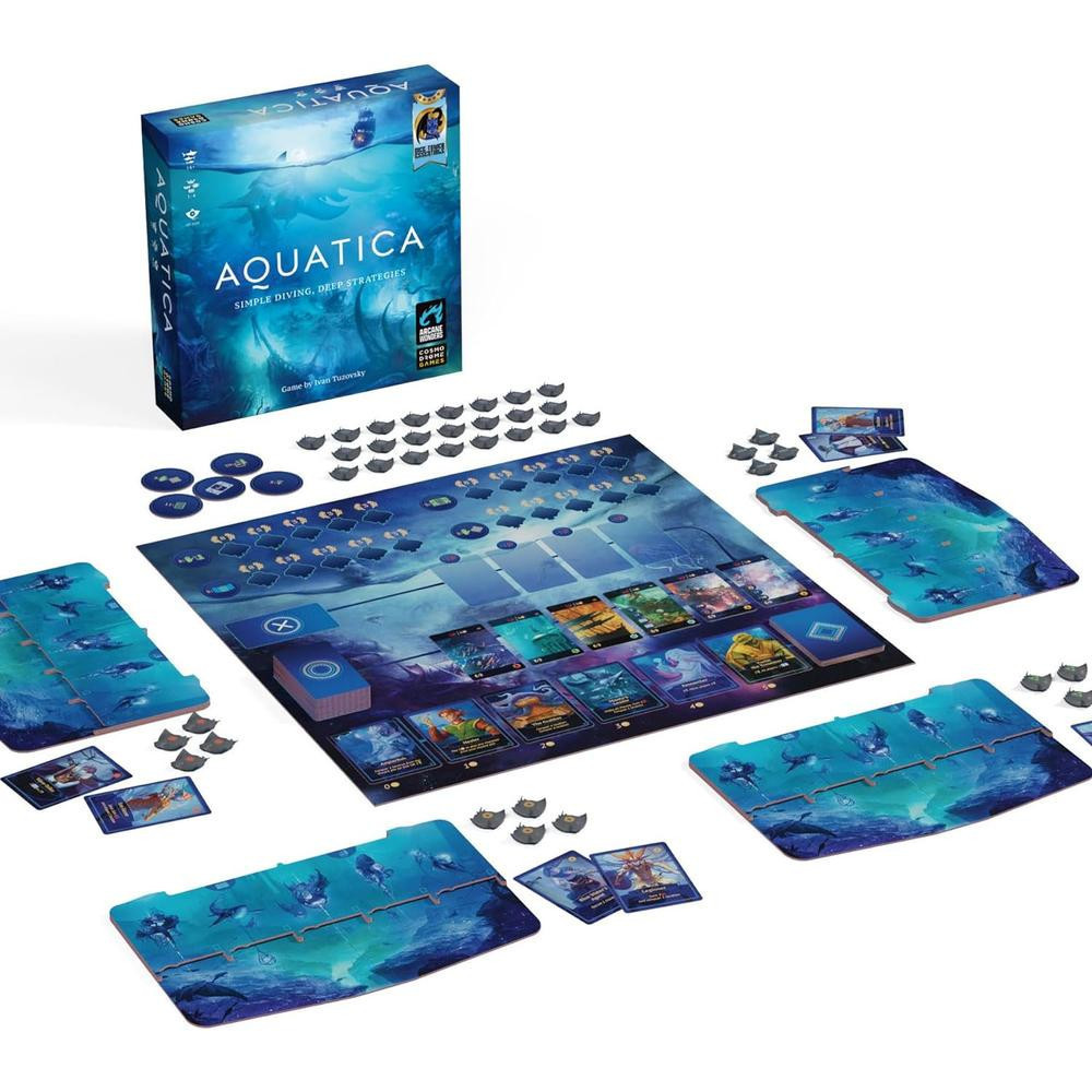 Indulj felfedezőútra az Aquatica társasjátékban, ahol víz alatti királyság uralkodójaként igyekszel megépíteni a legnagyobb birodalmat! Az óceán mélyének titkait kutatva találkozhatsz különleges vízalatti lényekkel, akik segítségével új területeket fedezhetsz fel és nyersanyagokat gyűjthetsz be. A célod, hogy minél több Prosperity pontot gyűjts, amit új helyszínek felfedezésével, riválisok legyőzésével és karakterek toborzásával érhetsz el. Minden döntés fontos, ezért alapos stratégiára lesz szükséged! A játékosok minden körben egy fő akciót hajtanak végre, miközben kihasználják a karakterkártyák nyújtotta lehetőségeket. A játék végén a legtöbb pontot gyűjtő játékos nyeri el a legnagyobb birodalom dicsőségét. Tökéletes választás 1-4 fő részére, 30-60 perces játékidővel, 12 éves kortól.
