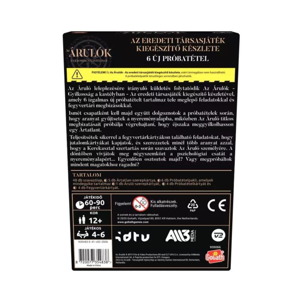 Az Árulók – Gyilkosság a kastélyban: Kiegészítő szett teszi még izgalmasabbá a játékot! Fedezd fel a kastély titkait és árulásait ezzel a csomaggal, ami hat új próbatételt tartalmaz, hogy új színt hozzon a játékélménybe. Végig a játékosoknak együtt kell működniük az arany gyűjtéséhez, miközben az Áruló a háttérben manipulálhat. A doboz tartalmaz mindent, ami a stratégiátok megmérettetéséhez szükséges: 48 szavazólap, 5 ártatlan és 1 áruló szerepkártya, 6 próbatételpakli, valamint néhány új cím- és fegyvertárkártya. A kiegészítő csak az alapjátékkal együtt játszható. Ideális 4–6 játékos számára, 30–60 perc játékidőt és 12 éves kortól ajánlott kalandokat kínál. Ne hagyd ki a lehetőséget, hogy belépj ebbe a bonyolult, rejtélyes világba!