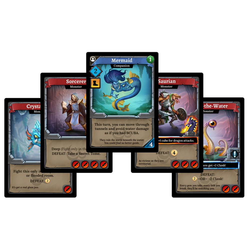 Megérkezett a Clank! legújabb kiegészítője, a Sunken Treasures! Légy részese egy izgalmas pakli-építős kalandnak, ahol félig elárasztott területek felfedezése vár rád. Készülj fel a környezeti kihívásokra és az eldugott mélységek titkaira, mint például egy mérges sárkányra!