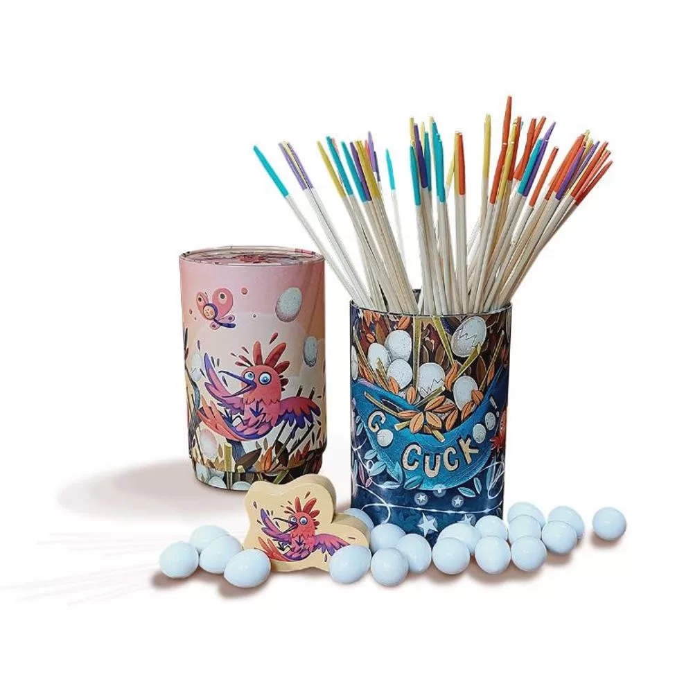 Illeszd össze a megfelelő színű darabokat, hogy biztonságosan elhelyezhesd a tojásokat a fészekben! Figyelj, hogy egyik darab se essen le, mert az büntetést von maga után. Ez a rendkívül szórakoztató és logikát igénylő játék izgalmas családi szórakozást nyújt. Vajon ki tudja leghamarabb biztonságba helyezni a fiókáit? A játék angol nyelvű. A doboz tartalma: 1 fészek alap, 1 kakukk figura (Kiki), 70 fa pálcika, 20 tojás jelölő és egy játékszabály.