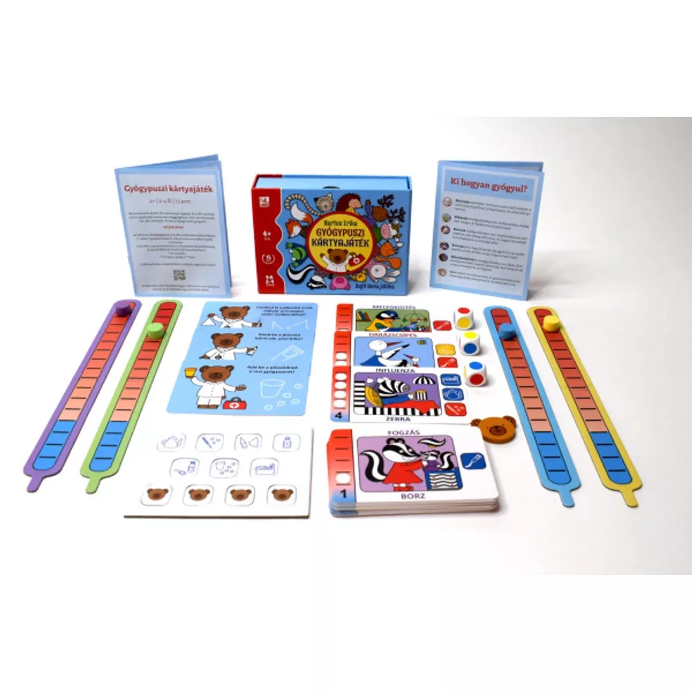 Fedezd fel a vidám Gyógypuszi Társasjátékot, amely Bartos Erika népszerű könyve alapján készült! Ez a különleges játék segít a gyerekeknek megismerkedni az orvosi vizsgálatok világával. Brummbrumm doktor és a kedves kis állatbarátok – cica, béka, egérke és csibe – mind gyógyulásra várnak. A játék célja, hogy a kicsik leküzdjék az orvoslátogatásokkal kapcsolatos félelmeiket, miközben vidáman játszanak.