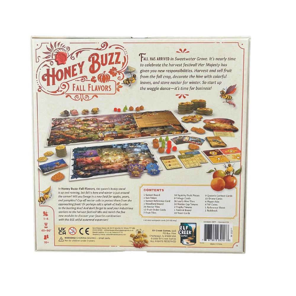 A falevelek hullanak, a szél hűvös szelei már őszt hoznak... de nem állhatsz meg! Töltsd újra a mézstandodat az őszi ínyencségekkel a Honey Buzz kiegészítőjével! Legyél te a legtehetségesebb a kaptárban! Az ősz számos új feladatot tartogat: szüreteld és árusítsd az őszi gyümölcsöket, díszítsd a kaptárt színes levelekkel, és készíts be a mézet télire. Az idős dolgozók megérdemelt tisztelettel vonulhatnak nyugdíjba a szüret ünnepén, miközben a nap lenyugszik az erdő felett.