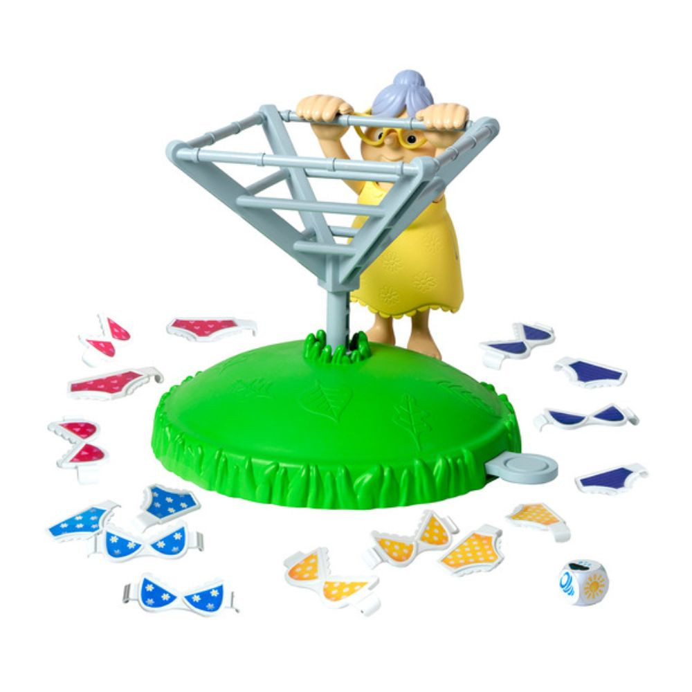 Kapaszkodj, Nagyi! izgalmas családi társasjáték, ahol a célod egyszerű: segíts a nagyinak kiteregetni a ruháit, mielőtt elszállna a vihar! A játék során minden dobásnál kíváncsian várhatod, hogy napsütést, esőt vagy tornádót dobsz-e. A játékosok felváltva dobnak a kockával: nap esetén új ruhadarabot akasztanak fel, eső esetén le kell venni egyet, tornádó esetén pedig indul a szárító őrült tánca! 3 db AA elem szükséges a játékhoz, amelyeket külön érdemes beszerezni. A csomag tartalma: