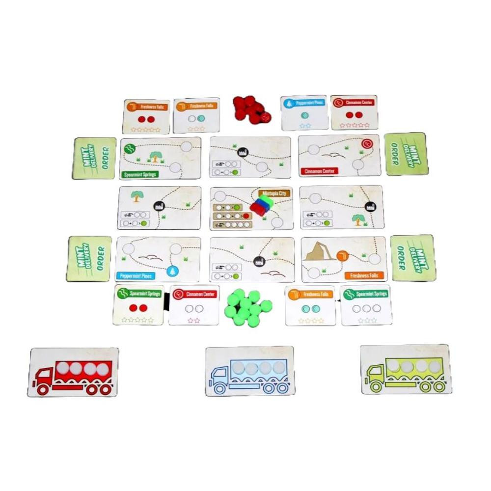 A Mint Delivery egy pörgős társasjáték, amit a cukorkásdoboz méretű tárolójával bárhová magaddal vihetsz. A játék során egy pénzszállító sofőr bőrébe bújsz, akinek célja, hogy a lehető legtöbb fuvart teljesítse, minél rövidebb idő alatt. A játék angol nyelvű. Indulj el a menta szállító kalandra, és építsd a saját menta birodalmadat! Te vagy a menta szállítmányozó, aki Mort gyárából viszi a frissen készült mentákat a környező településekre. A cél: a legtöbb rendelést teljesítve elnyerni a hónap dolgozója címet, miközben a legjobb profitot éred el. A játék izgalmas döntésekkel teli! Minden játékos két akciót hajthat végre a körében: mozgás, rendelés felvétele, teherautó feltöltése, rendelés teljesítése vagy menta fejlesztés. Célozd meg, hogy minél több megrendelést teljesíts, és mindig rendelkezz a megfelelő mentákkal a szállításhoz.