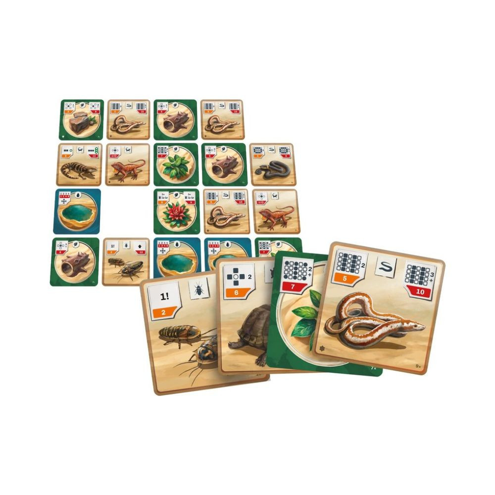 Fedezd fel a terráriumok élővilágát, ahol hüllők, békák és buja növényzet vár! Ez a kártyajáték stratégiai mélységeket tartogat 1-6 játékos számára, miközben mindenki saját terráriumot épít. A játékosok draftolással választanak kártyákat, majd tablauba helyezik őket, hogy megfelelő élőhelyet, menedéket és táplálékot biztosítsanak az állatoknak. A növénykártyák árnyékot adnak, míg a hüllők és békák eltérő igényeket támasztanak. A játék célja, hogy a legtöbb pontot gyűjtsd a hüllők és növények elhelyezésével és a harmónia fenntartásával.