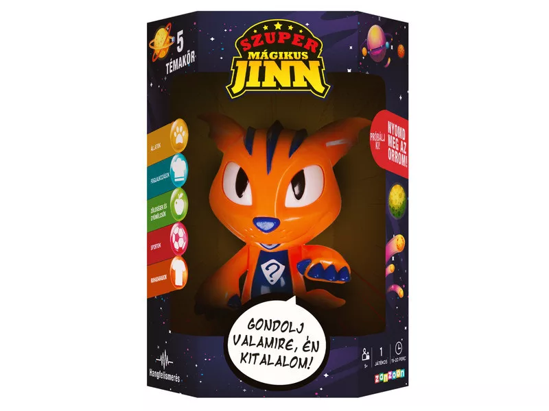„Gondoltál valamire… és én ki fogom találni!” – szólít meg a kis Jinn, az interaktív játékfigurád. Ha szeretsz barkochbázni, ez a játék neked való! Válassz egy témát az öt közül: állatok, ruhadarabok, zöldségek és gyümölcsök, sportok vagy foglalkozások, és kezdődhet is a kérdezősködés. Jinn eldöntendő kérdésekkel próbálja kitalálni, mire gondoltál, te pedig válaszolhatsz „igen”, „nem”, „attól függ” vagy „nem tudom”. Ha trükkös vagy, talán sikerül megtévesztened! A hangfelismerésnek köszönhetően a játék valódi beszélgetéssé válik, rabul ejtve a gyerekeket és felnőtteket egyaránt. A játék nyelve: magyar. Doboz tartalma: