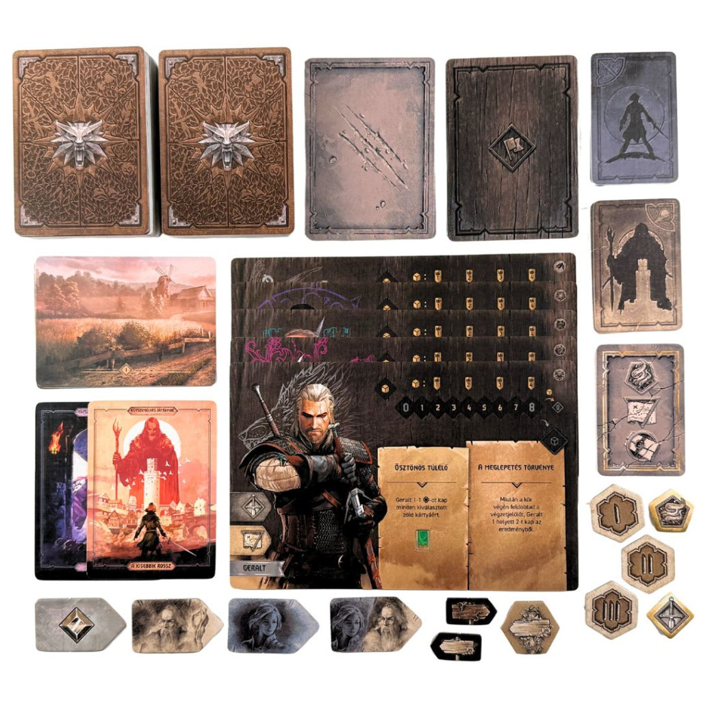 A The Witcher: A végzet útja egy izgalmas, kompetitív 1-5 fős tablóépítő kártyajáték, amelyben a Vaják-univerzum ikonikus karaktereinek bőrébe bújtok. A játékmenet során a történet meglepő fordulatokat vehet, így a végeredmény eltérhet az eredeti kánontól. Csapatként dolgoztok, de egyéni győzelemre törekedve kell befolyást szereznetek a történet alakulására, hogy ti legyetek a sztori főhősei. A történet három fejezetből áll, mindegyik három körre oszlik, és minden körben három fontos lépést kell végrehajtani: Kártyaválasztás, Kártyakijátszás és A végzetjelölő lehelyezése. A játék végeztével a pontozás határozza meg a győztest, de az újrajátszás lehetőséget ad a végkifejlet megváltoztatására. A doboz tartalma: