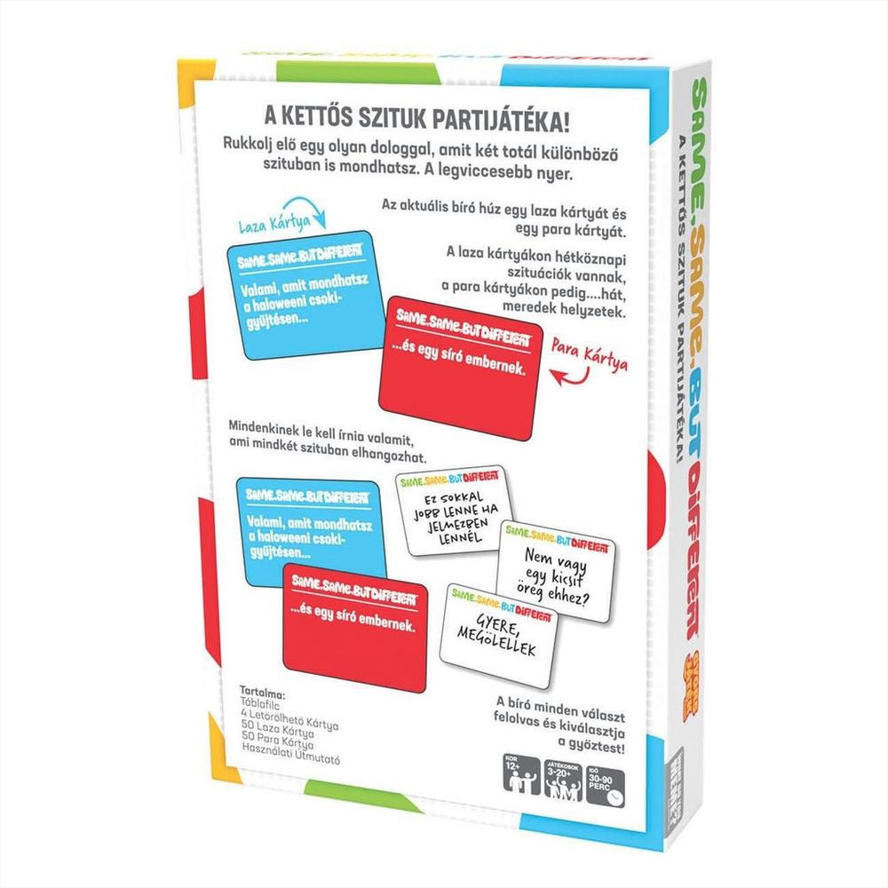 Merj szellemes lenni! Ebben a pörgős, kreatív partijátékban nevetés és ördögi szójátékok várnak! Kétféle kártya küzd meg az asztalon: egy biztonságos, laza helyzet és egy merész, feszültséggel teli szituáció. A feladatod? Dobd be azt az egyetlen mondatot, ami mindkettőre illik, és lásd, ahogy a többiek a röhögés és borzongás közötti vékony határon lavíroznak.