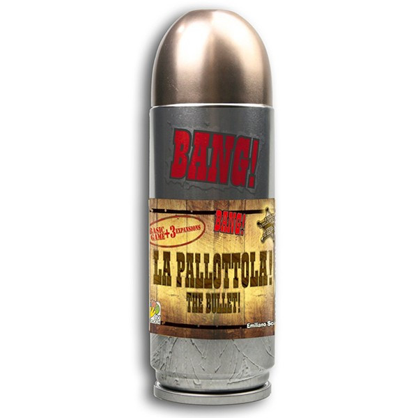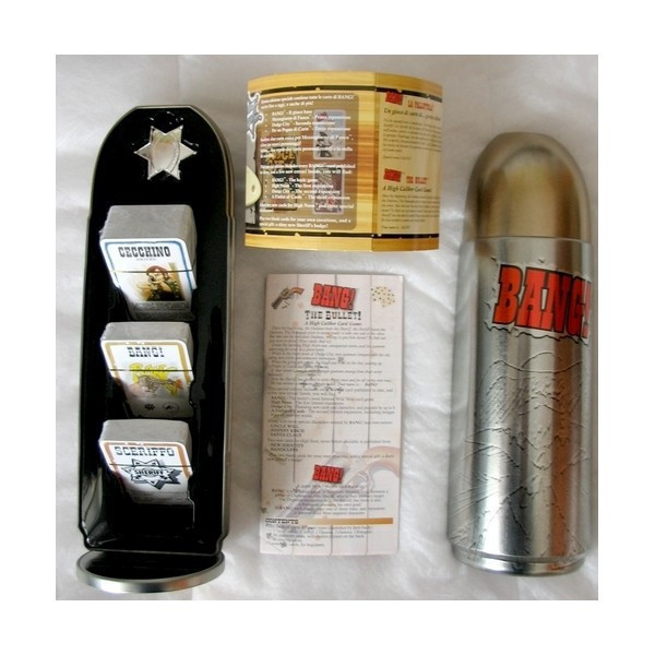 A többszörös díjnyertes BANG társasjáték "díszdobozos" (töltény alakú doboz) változata. Figyelem! A játék angol és olasz nyelvű! A doboz tartalmazza: