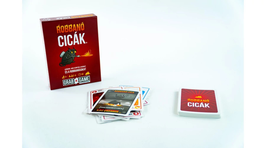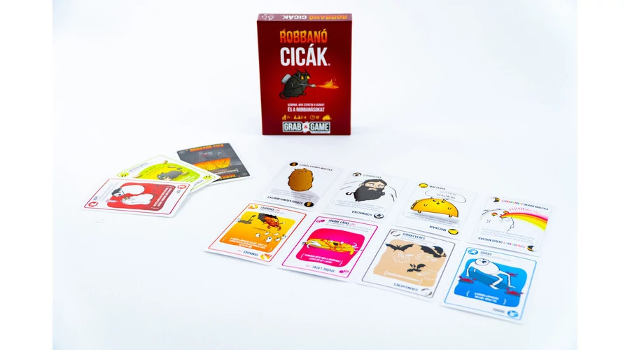A Robbanó cicák Grab&Game a nagysikerű, frenetikus partijáték, a Robbanó cicák zsebre vágható, úti kivitele. Legfeljebb 4 fős társaságok és családok számára ideális választás. A morbid grafikával illusztrált lapok között válogatva a körödben bármennyi lapot kijátszhatsz, hogy társaidtól vagy a dobópakliból lapot húzz, megnézd a húzópakli legfelső lapjait, vagy akár újra is keverd azt, csak hogy elkerüld a veszélyes házi kedvencek kezükben történő felrobbanását – és így a kiesést!