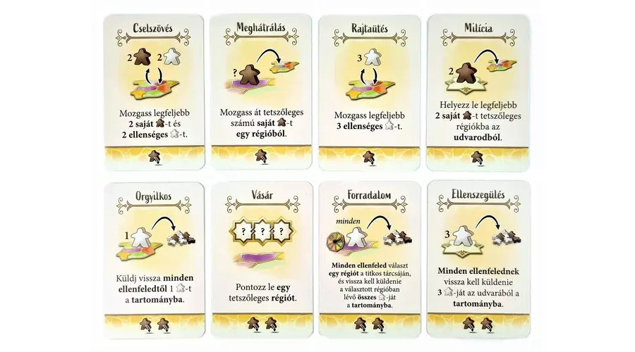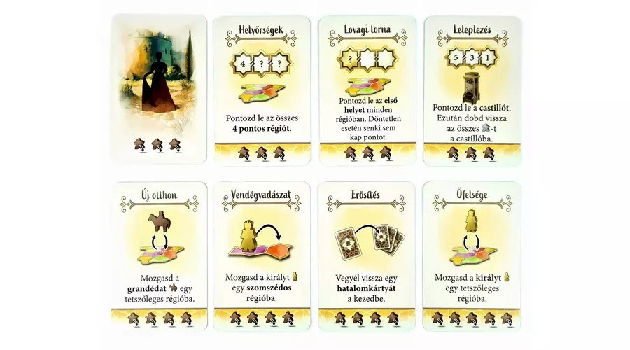 Minden egyes kilenc körből álló játék során kiválasztasz egyet a 13 hatalmi kártyádból, hogy meghatározd a sorrendet és hogy hány lovagot mozgathatsz a tartományokból (általános készlet) az udvarodba (személyes készlet).