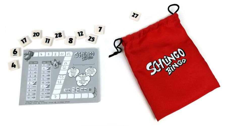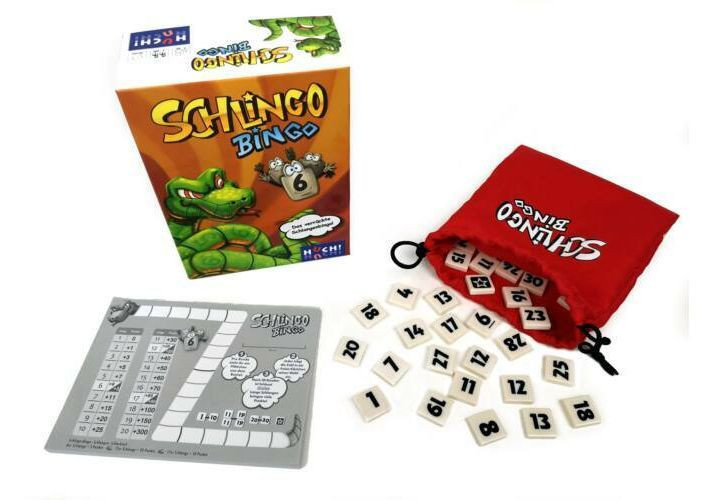 Néha egyetlen szám megnevezése is nagy érzelmi kitöréseket okozhat - először tegnap este a lottószámok kihúzásakor, most pedig a játékasztalnál: A "Schlingo Bingóban" a számokat jó bingó módjára húzzák ki, amelyeket minden játékosnak be kell írnia a cetlijébe. Aki azonban négyzetrácsot keres, az csalódni fog, helyette inkább a sziszegő slingókígyót ismerheti meg. Ha a slingót növekvő sorrendben számokkal eteted, és a lehető leghosszabb kígyót hozod létre, nyer. A "Schlingo Bingo" egy tökéletes gyors játék szórakozás, amelyet a praktikus táskának köszönhetően útközben is lehet játszani.