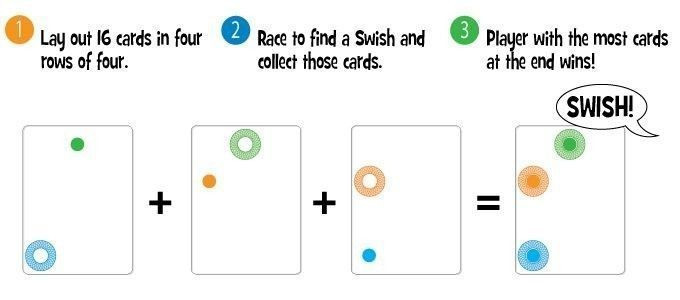 Vedd kézbe ezt a különleges kártyajátékot, melyben a cél párok, ún. Swish-ek kialakítása. Ehhez legalább 2, de akár 12 áttetsző kártyát is egymásra kell pakolnod, hogy az egyes pontok a nekik megfelelő színű gyűrűbe kerüljenek. A kártyák egymásra tétele után egyetlen pont vagy gyűrű sem állhat önmagában. Aki a legtöbb párt állítja össze a játék során, az nyer!