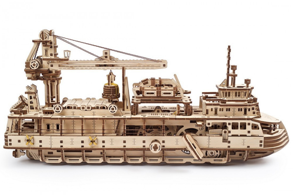 A kutatóhajó minden részlete kiváló minőségű, környezetbarát fából készül, amelynek összeszereléséhez nincs szükség ragasztóra vagy további eszközökre. Az edény testének „csontváza” kialakítása lehetővé teszi, hogy belenézzen a raktérbe és a gépterembe, és megnézze, mi mozgatja őt. A modellt meghajtó energiát gumiszalagos motor állítja elő, és egy inga irányítja. Az okos sebességváltó-elrendezés ebben a blokkban utánozza a dízelmotor hangját, és egyenletes és egyenletes tempót biztosít az edény számára. A modellnek három mozgásmódja van - előre, hátra és automatikus manőverezés. Az üzemmódokat egy kézzel kapcsolható karral lehet vezérelni.